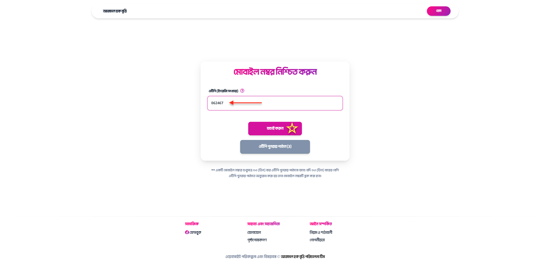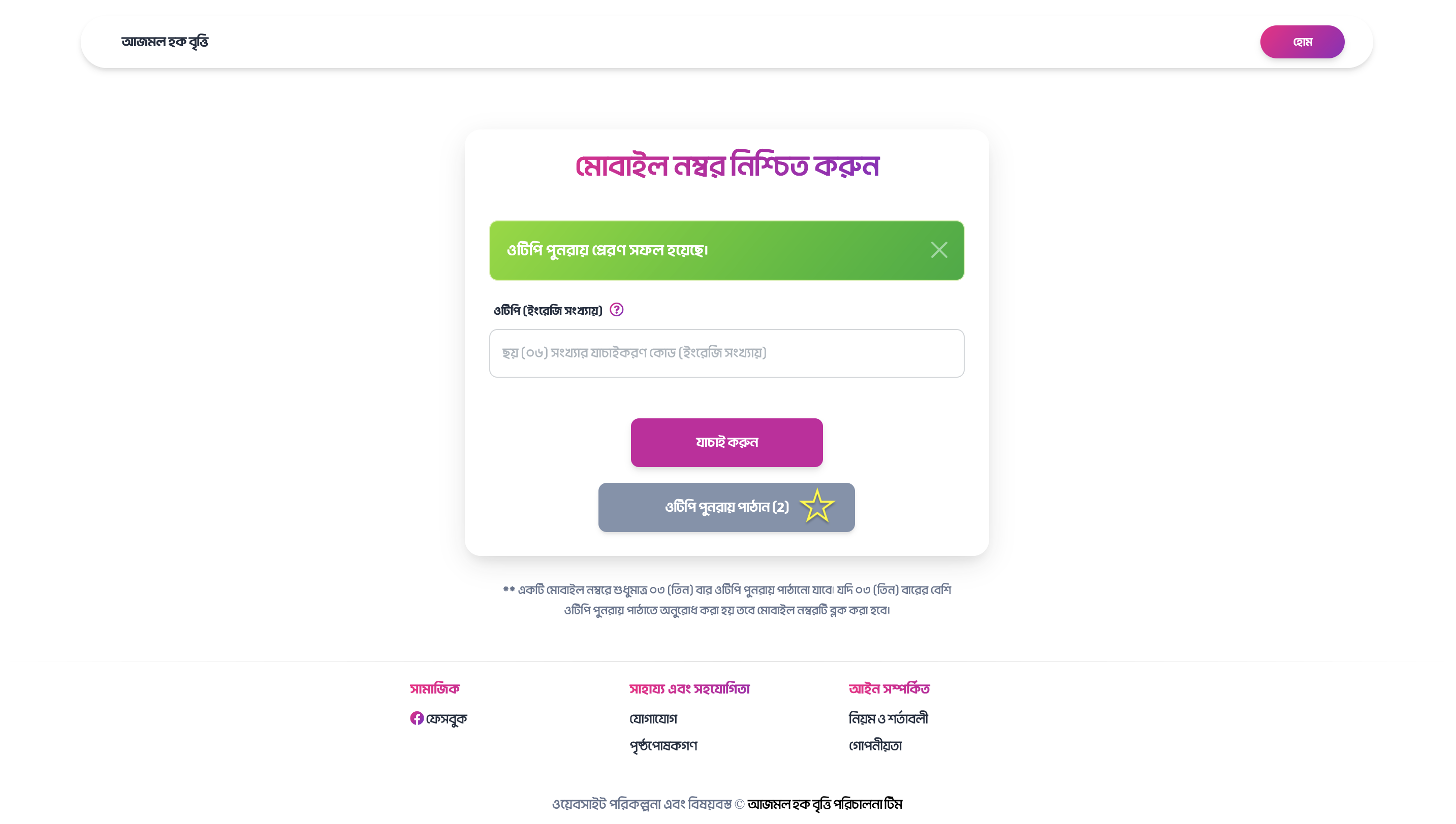 যদি প্রথমবার ওটিপি যাচাইকরণ ব্যর্থ হয় বা আপনি দুই (০২) মিনিটের মধ্যে একটি এসএমএস না পান, তাহলে আপনি 'ওটিপি পুনরায় পাঠান'-তে ক্লিক করে আরেকটি ওটিপি পুনরায় পাঠাতে পারেন। আপনি একটি মোবাইল নম্বরে শুধুমাত্র তিনটি (০৩) ওটিপি এসএমএস পুনরায় পাঠাতে পারবেন। নতুন ওটিপি আপনার মোবাইল ফোনে পেয়ে গেলে, পুনরায় ধাপ ০৩ থেকে শুরু করুন।